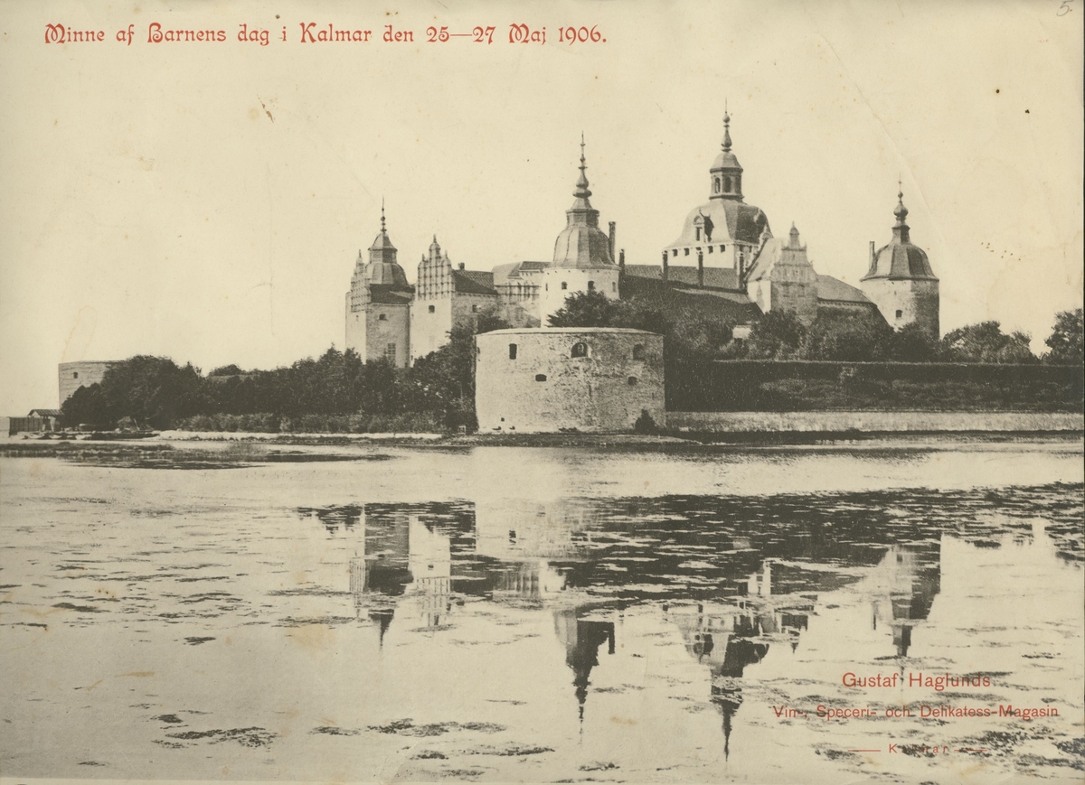 Vykort med Kalmar slott. Text: Minne av barnens dag i Kalmar den 25-27 maj 1906.