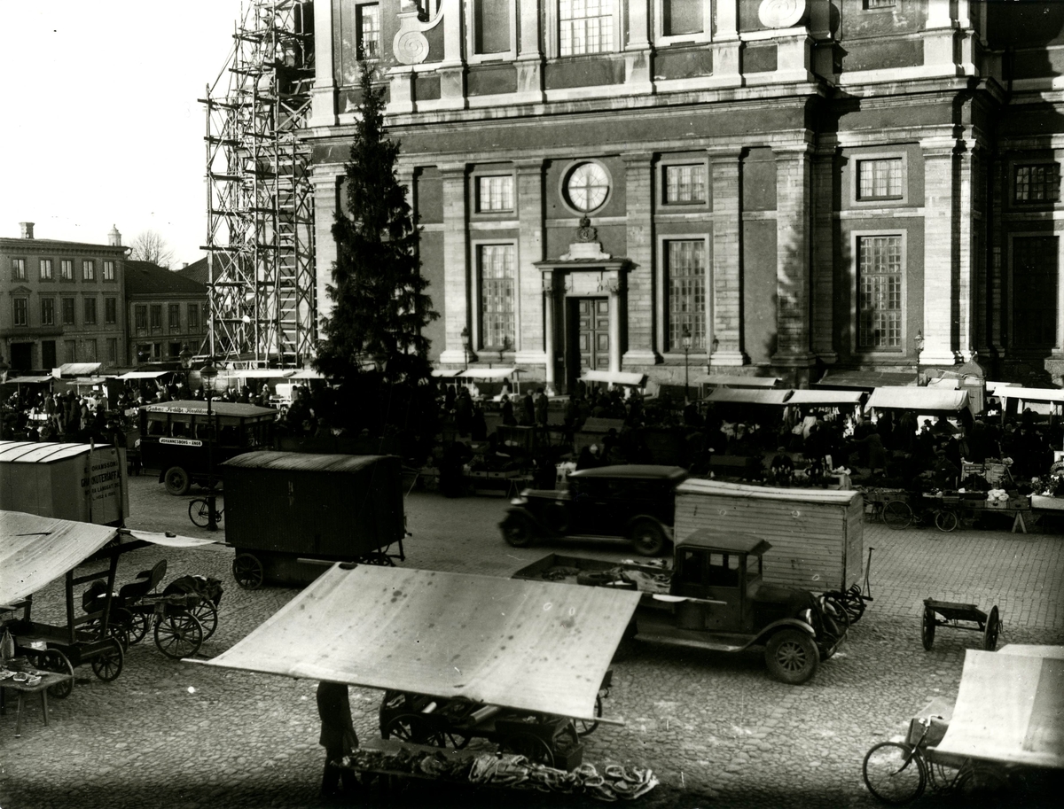 Torghandel 1929-1930. En av stadens första bussar på linjen Johannesborg- Ängö. (Röda linjens ägare Dahlbom).