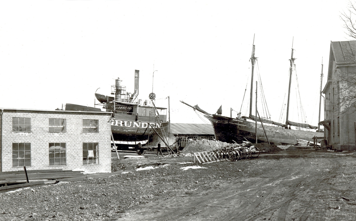 Ett fyrskepp och en tremastad skonare på Kalmar varv.