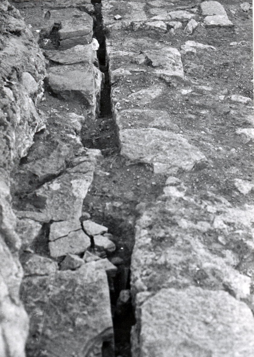 Utgrävning på Kalmar slott. Sprickan mellan östra vallmuren (till vänster i bild) och den äldre muren, sedd mot söder. Rapporten: Krutkammaren, vallgraven, västra vallen och brunnar.