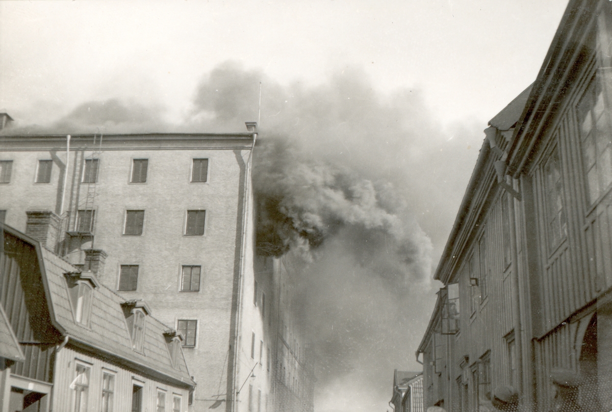 Ångkvarnsbranden 1935-07-06. Bilden är tagen längs Proviantgatan och visar hur röken bolmade ut.