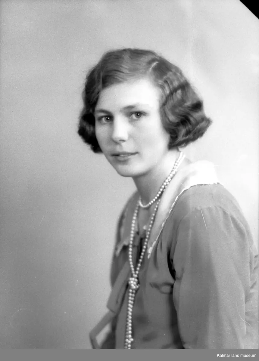 Ateljébild på en kvinna i pärlhalsband och klänning. Enligt Walter Olsons journal är bilden beställd av Anna Johansson.
