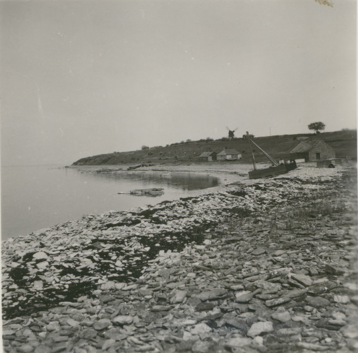 Stranden vid Äleklinta. Bilden är tagen 1950 men bodarna och den gamla sumppråmen ser ännu (2024) likadana ut.