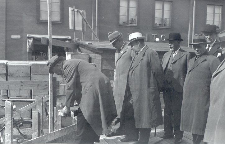 Hotell Witt. Stadsfullmäktige ordförande Gustaf L Johansson lägger första stenen vid ombyggnaden av Hotell Witt i Kalmar 1939.