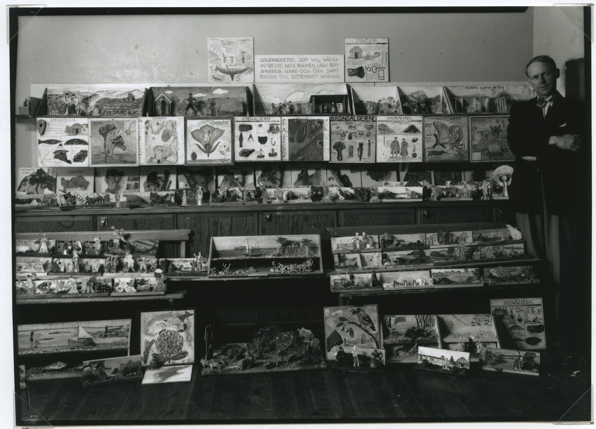 Folkskoleseminariet. Lärarkurs. Mannen på bilden är seminarielärare Eric Bojs som illustrerat de läromedel som avbildas.