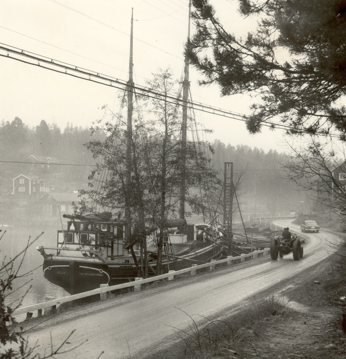 Ms Olga, hemma i Solstadström, vid kaj där, i vinterlag. Galeas, byggd 1906 i Viken. 90 bruttoregisterton. Ägare 1957: Sten Osk. Thure Johansson.