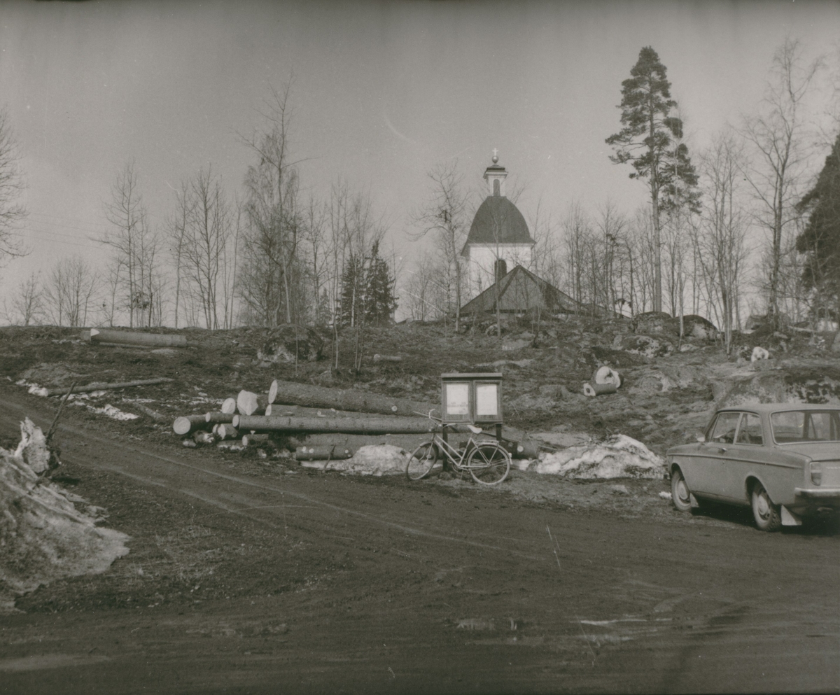 Blackstads kyrka. Foto från öster (från Hallingebergsvägen), taget efter avverkningen i mars 1969.