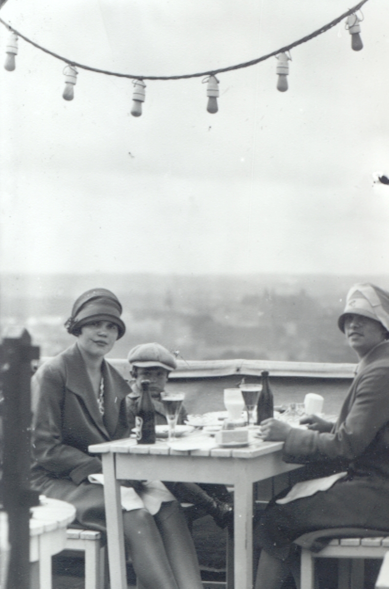 Kvinnor och pojke på uteservering, troligen på gamla Byttan i Kalmar.