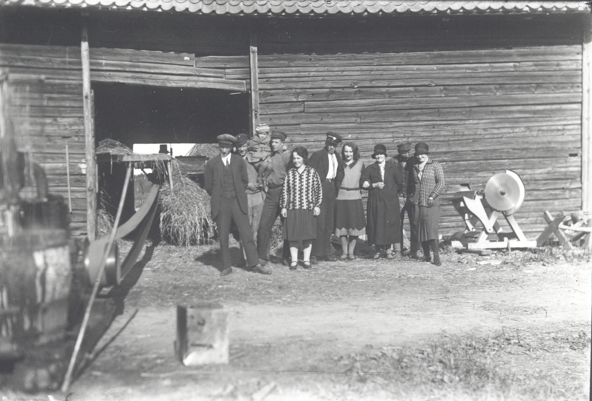 Familj och gårdsfolk på lagårdsbacke med höfläkt. Till höger en vedkap.