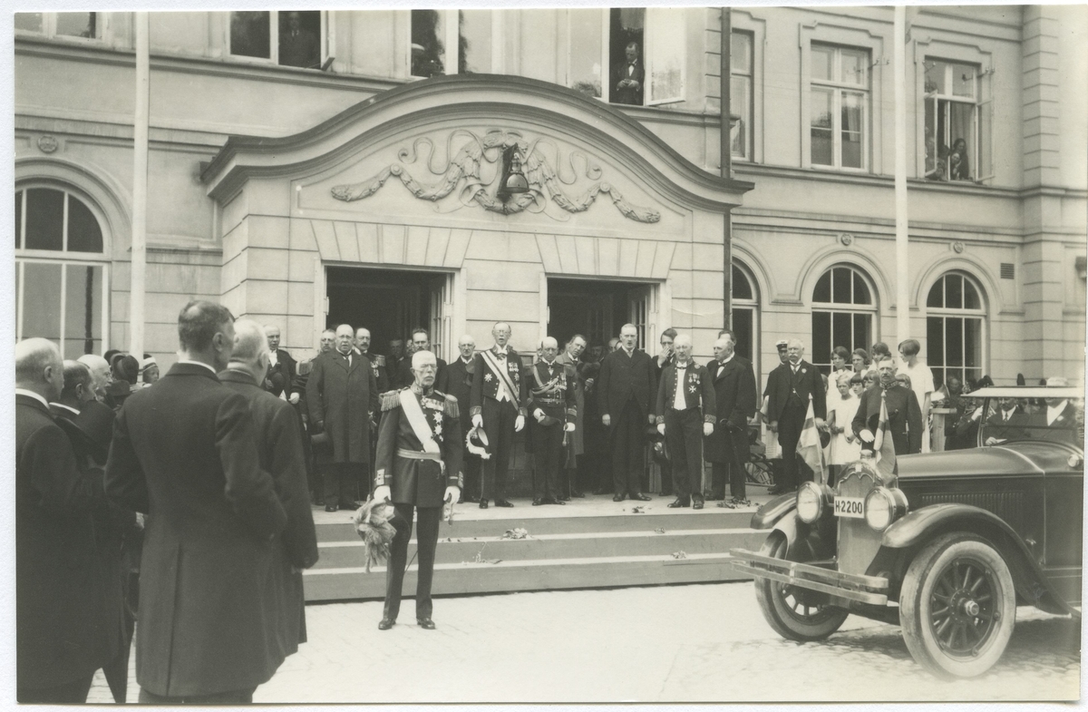 Gustav V anländer. Bilen en Buick 1924-1925 Master model tillhör droskägare August Lindh Kalmar. Landshövding John Falk vid höger dörr i uniform.