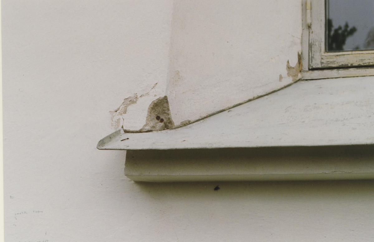 Dalhems kyrka, putsad fasad med fönster, foto från renoveringen 1993.