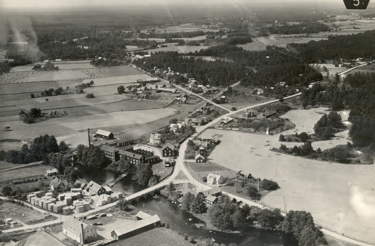 Flygfoto över Blomstermåla med fanérfabriken..