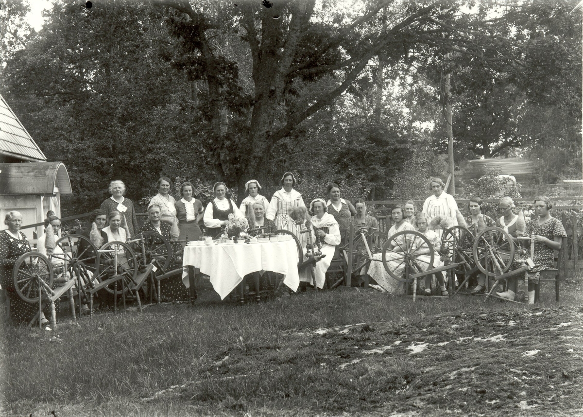 Här håller hushållningssällskapet spinnkurs med medlemmar från Västervik 1935.
