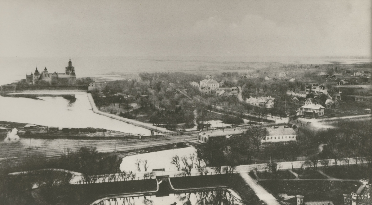 Översiktsbild över Kalmar slott och stadsparken från vattentornet.