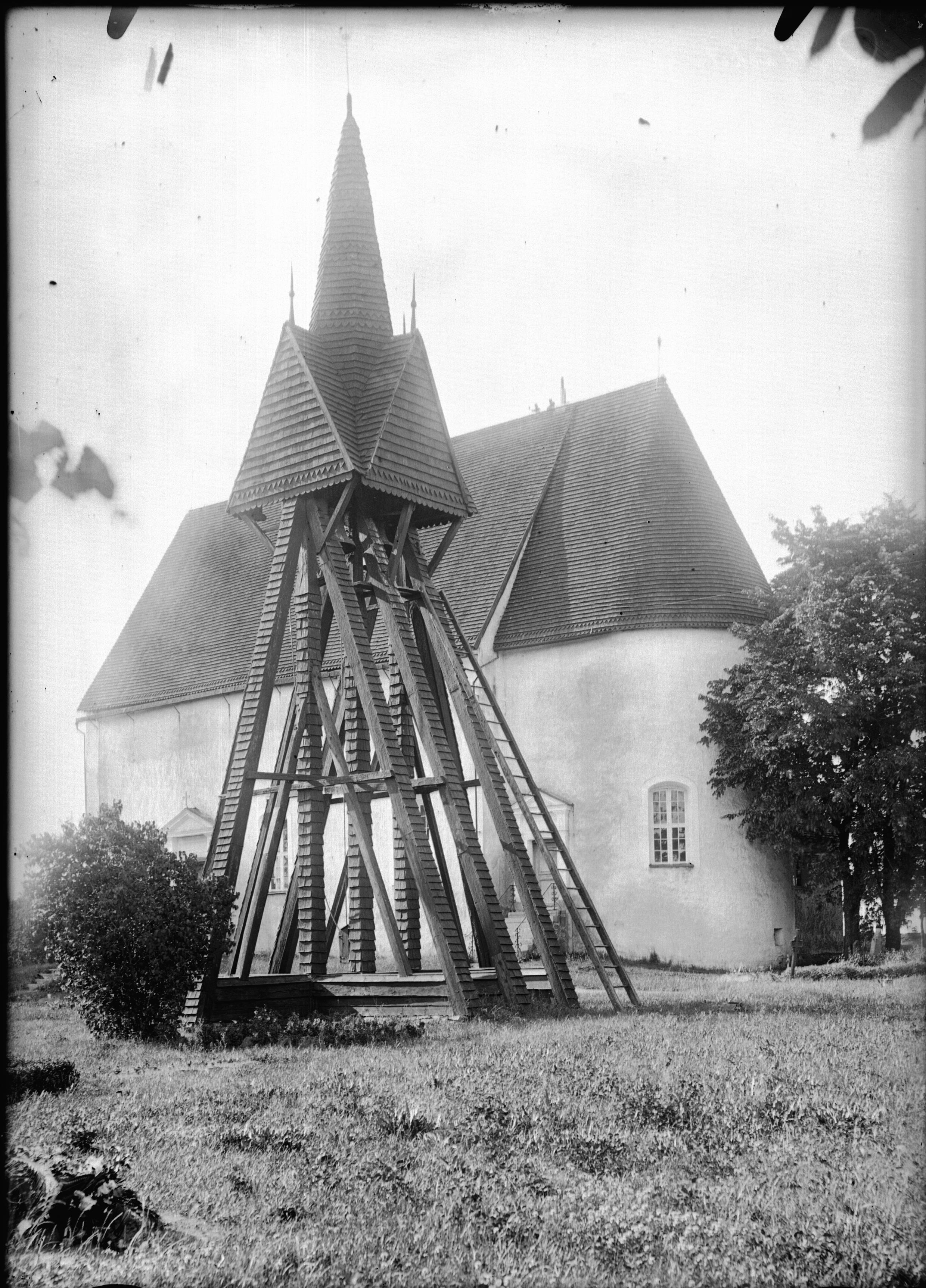 Kyrkan mot sydöst med klockstapeln i förgrunden.