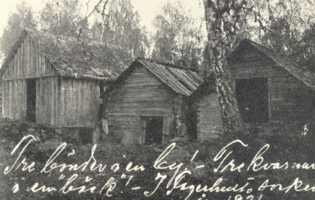 Ett foto med påskriften "Tre bönder i by ! Tre kvarnar i en bäck ! i Fagerhults socken 1921."