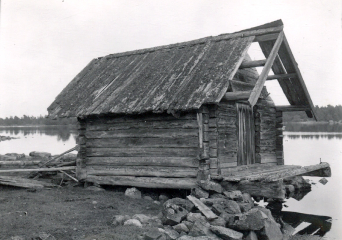Fiskebod. Längd mellan gavlarnas yttersidor 3,17 meter. Bredd mellan väggarnas ytterliv 3,43 meter. Svale vid båda gavlarna. Vertikala dubbelhaksknutar. Foto från sydväst.