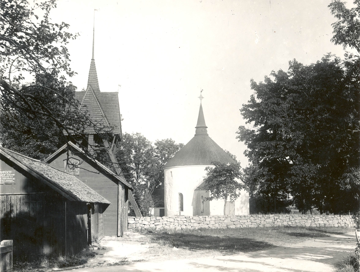 Voxtorps kyrka med klockstapel. Bodar i förgrunden.