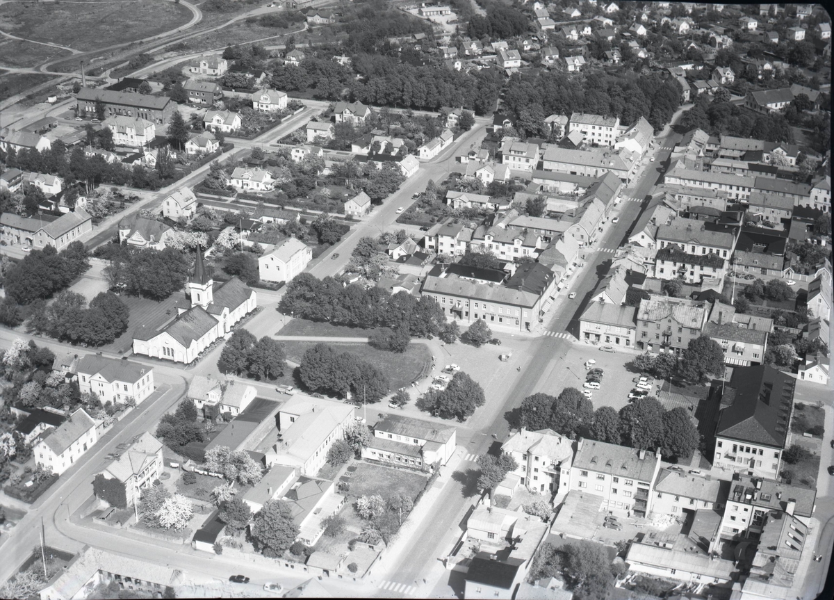 Flygfoto över Borgholm. Samhället med byggnader och vägar.