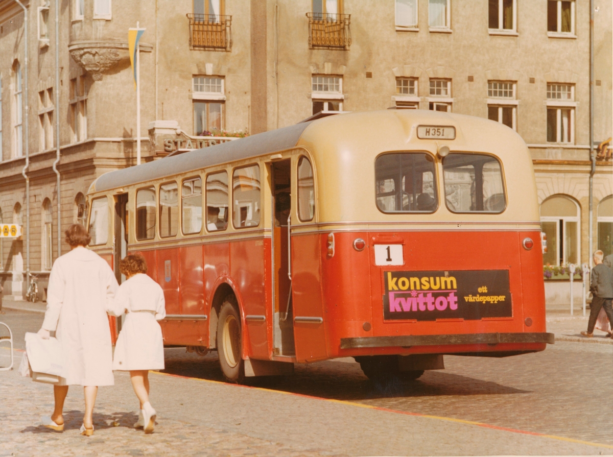 Buss med reklam för Konsumkvittot vid Stadshotellet.
