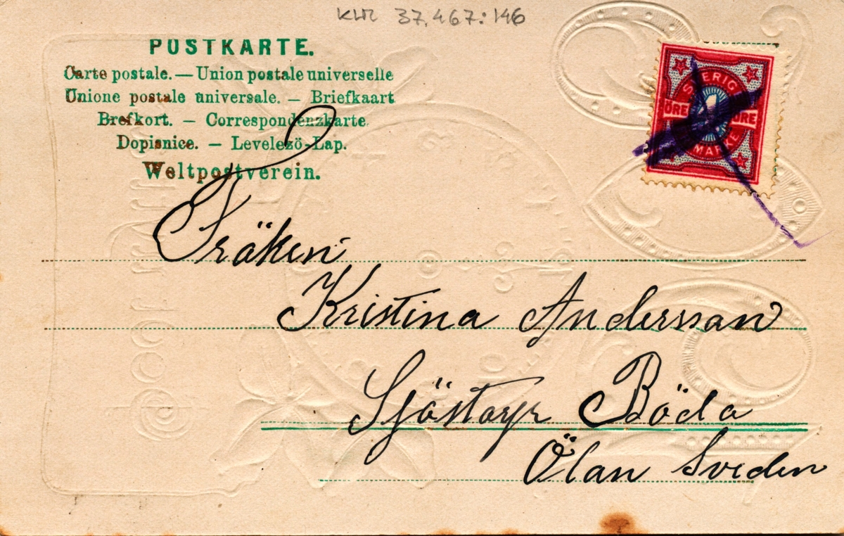 Ett nyårskort till fröken Kristina Andersson, Sjötorp, Böda, Öland, Sweden, från Ida Andersson.