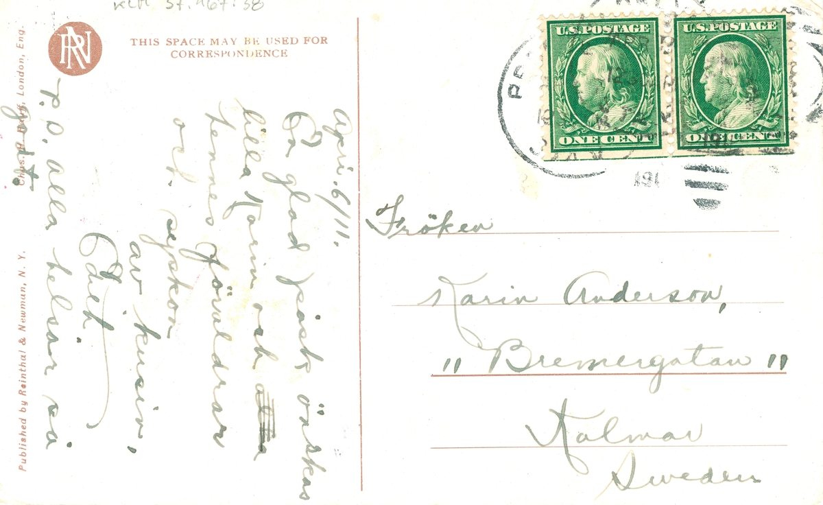 Text på vykort: "En glad påsk önskas lilla Karin och hennes föräldrar och syskon av kusin Edith. PS Alla hälsar så godt."