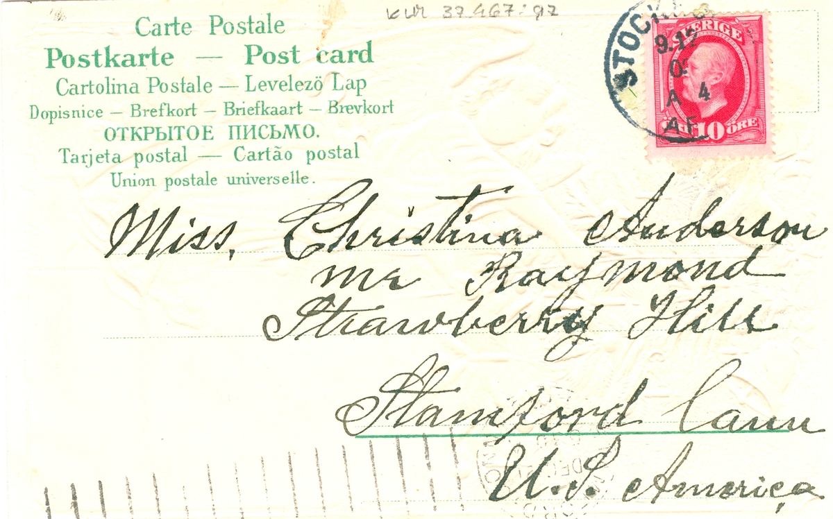 Ett julkort till Christina Anderson, Stamford, Connecticut, USA. Det är skrivet av Edvard Nilsson i Böda.