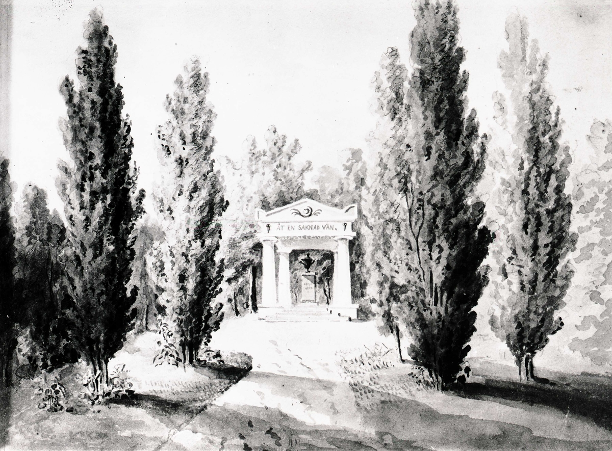 Värnanäs gård, monumentet. Engelska parken. Akvarell av Jon Carl Linnerhielm.