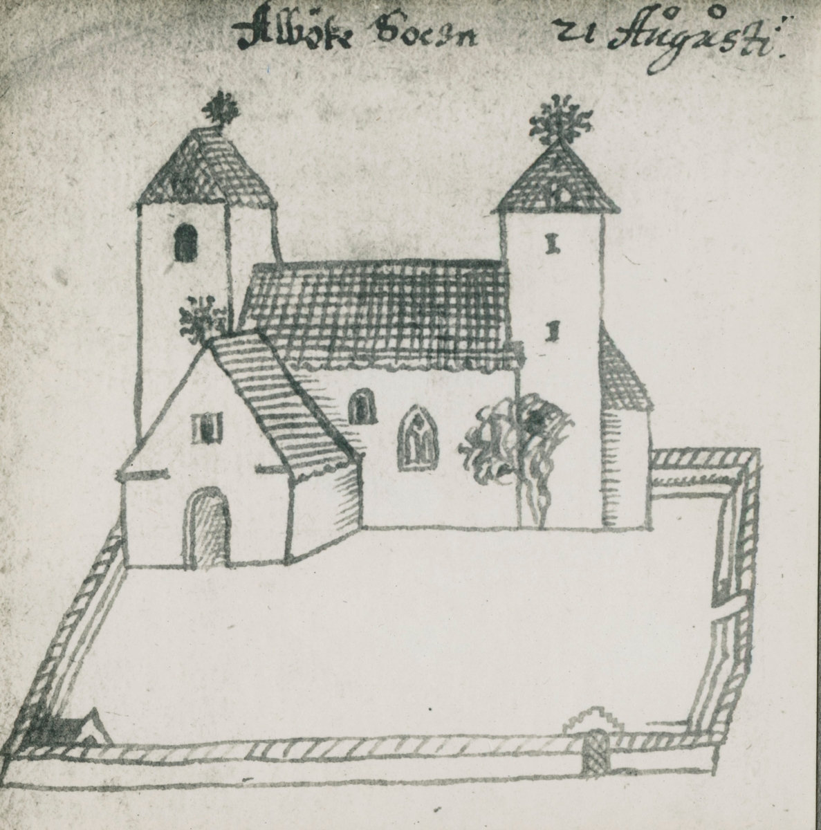 Alböke kyrka. Petrus Törnewall teckning efter Johannes Haquini Rhezelius.