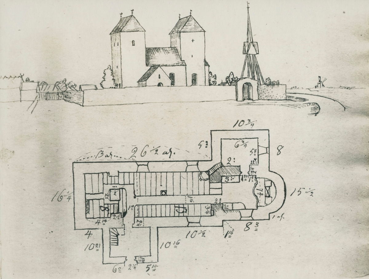 Alböke kyrka. Petrus Törnewall teckning efter Johannes Haquini Rhezelius.