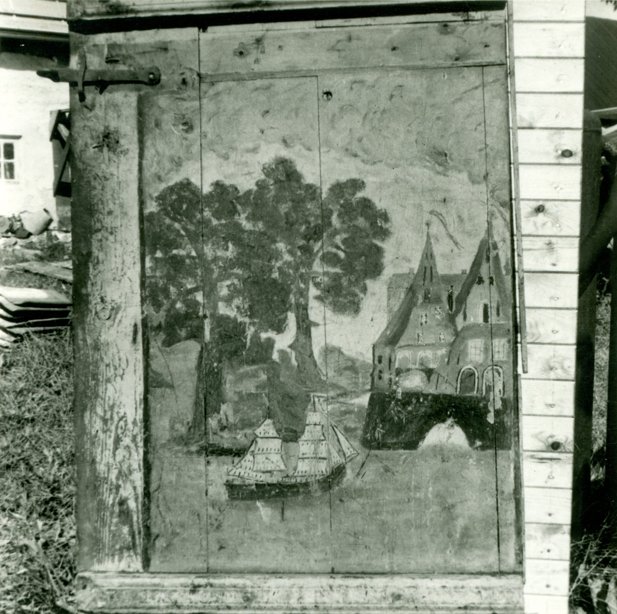 Dörr med målad dekor, hittad i flygeln vid gårdens restaurering 1954.
