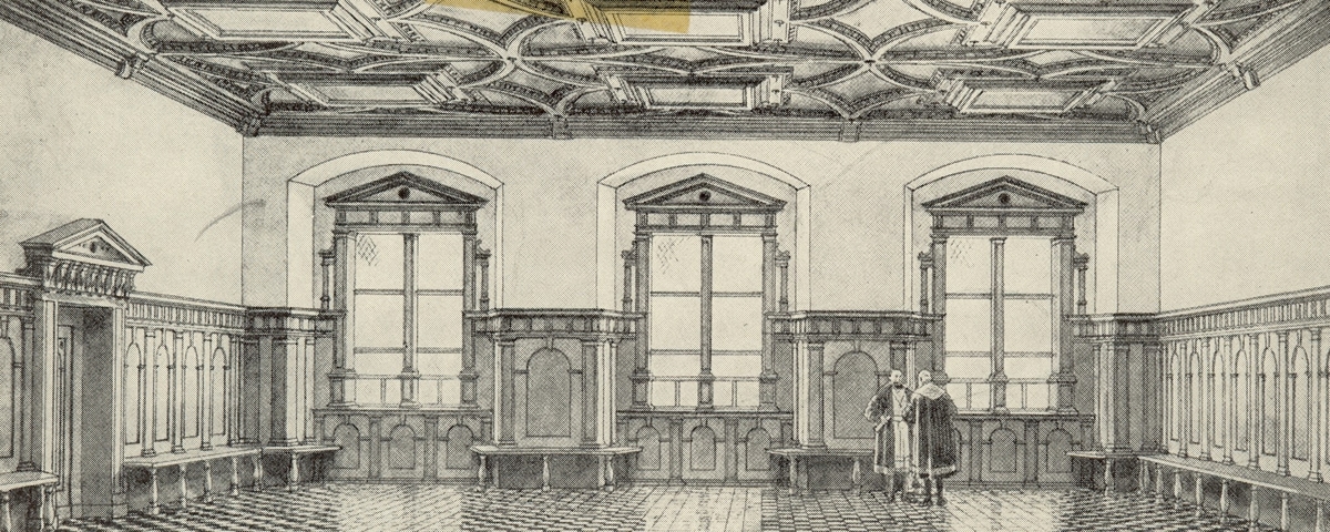 Teckning av ett rum i Kalmar slott med kolonner, kassettak och tympanoner.