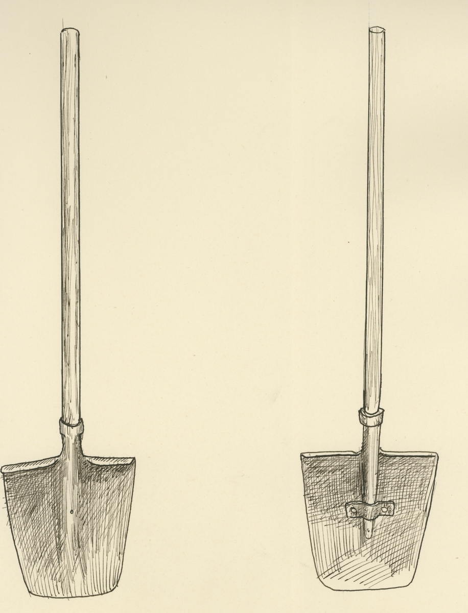 Teckning av en spade. Höjd: 20 cm, bredd 24 cm, sSkaft 67 cm.