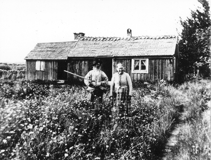 Okänt torparpar framför sin lilla stuga.