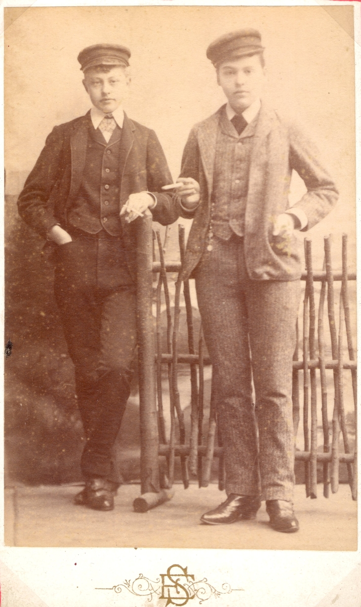 Ellen Warholm och väninna i tonåren, utklädda till ynglingar i kotymer med väst, kepsar och cigaretter i händerna.