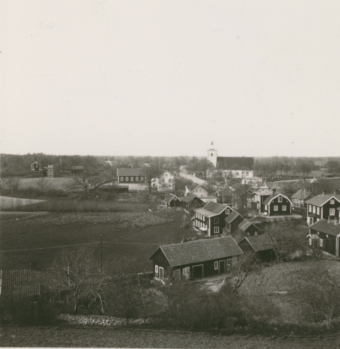 Vy över Rockneby med kyrkan till höger i bakgrunden.