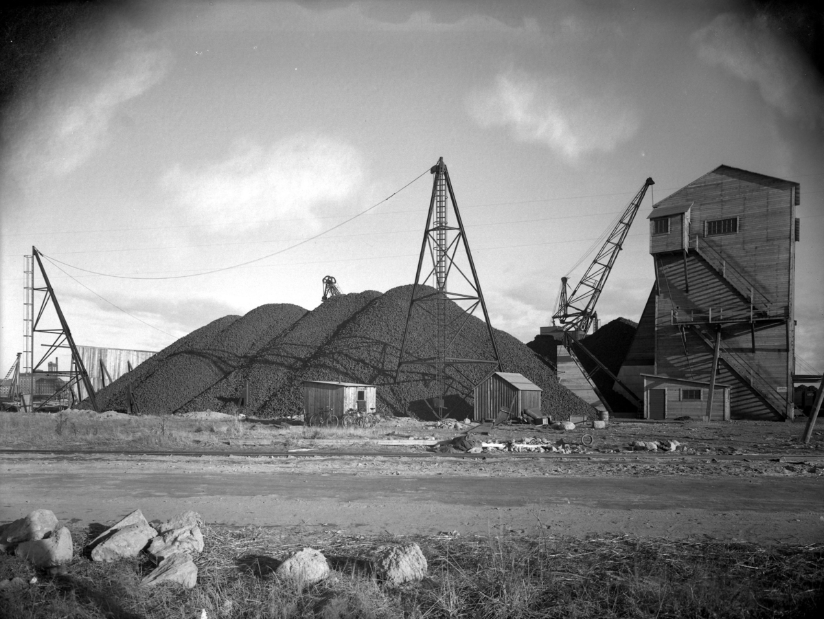 Ett kolupplag med lyftkranar i hamnen i Kalmar.