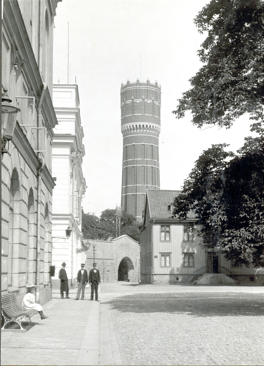 Vattentornet i Kalmar med Västerport framför. Kalmar teater och frimurarhotellet till vänster.