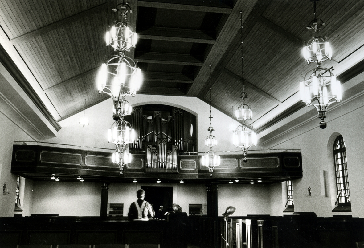 Interiör mot läktaren efter restaurering.