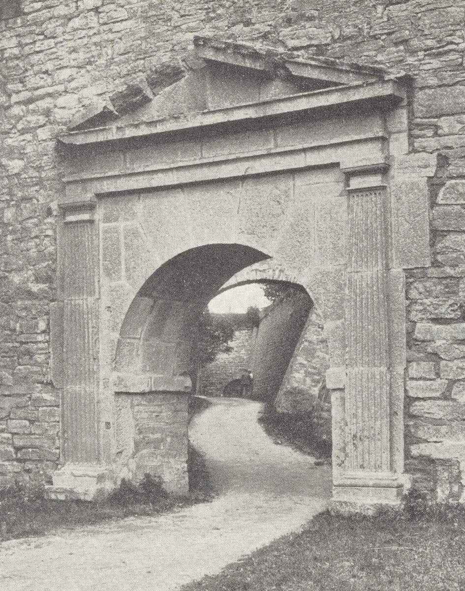Kalmar slott. Östra förborgen. Portalen i förbindelsemuren mellan fångetornet och östra postejen. Huggen av Roland Maddes verkstad och uppsatt 1562.