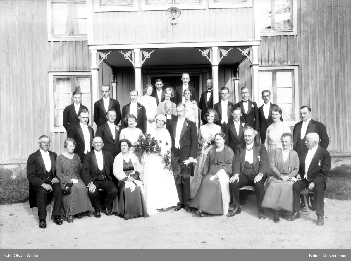 Bild på ett brudpar med brudtärnor, marskalker och bröllopsgäster.