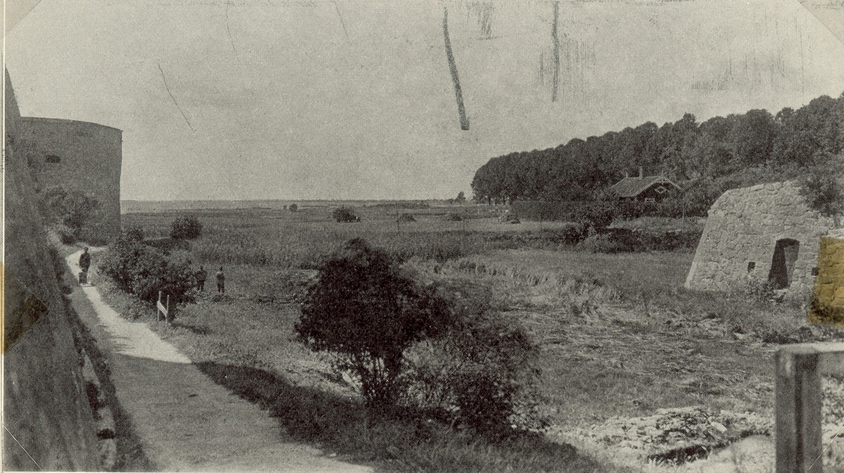 Vallgraven. Kalmar slotts slottsvall och en postej till vänster.