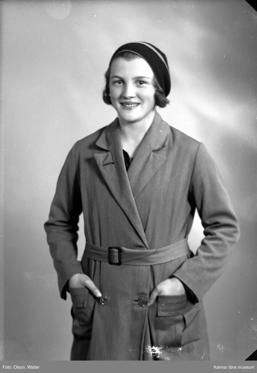 Ateljébild på en kvinna i kappa och mössa. Enligt Walter Olsons journal är bilden beställd av Ruth Andersson.