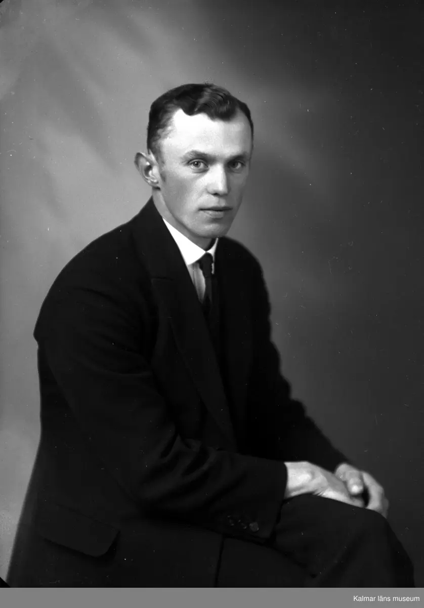 Ateljébild på en man i kostym. Enligt Walter Olsons journal är bilden beställd av C Swensson.