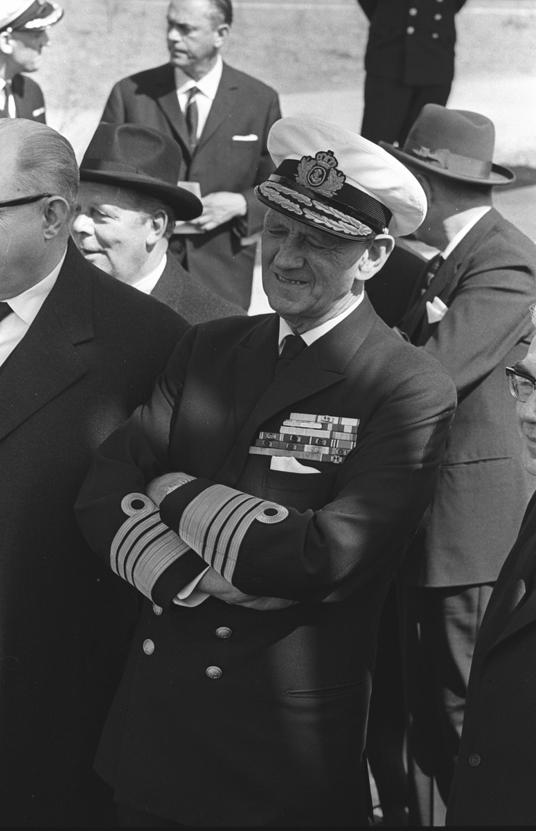 Invigning av "Fågelvägslinjen" mellan Rodbyhavn, Lolland, Danmark och Puttgarden, Fehmarn, Tyskland. Den nya färjelinjen kallas "Fågelvägslinjen", på danska Fugleflugtslinien och på tyska Vogelflugslinie, eftersom linjen följer flyttfåglarnas flygrutt. Danmarks kung Frederik IX, till höger