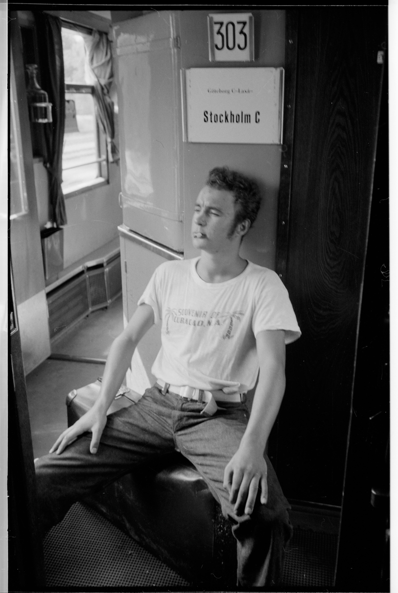 Titel: Ung man som tar en rökpaus i vagnskorridoren, någonstans på linjen mellan Göteborg C - Laxå - Stockholm C.