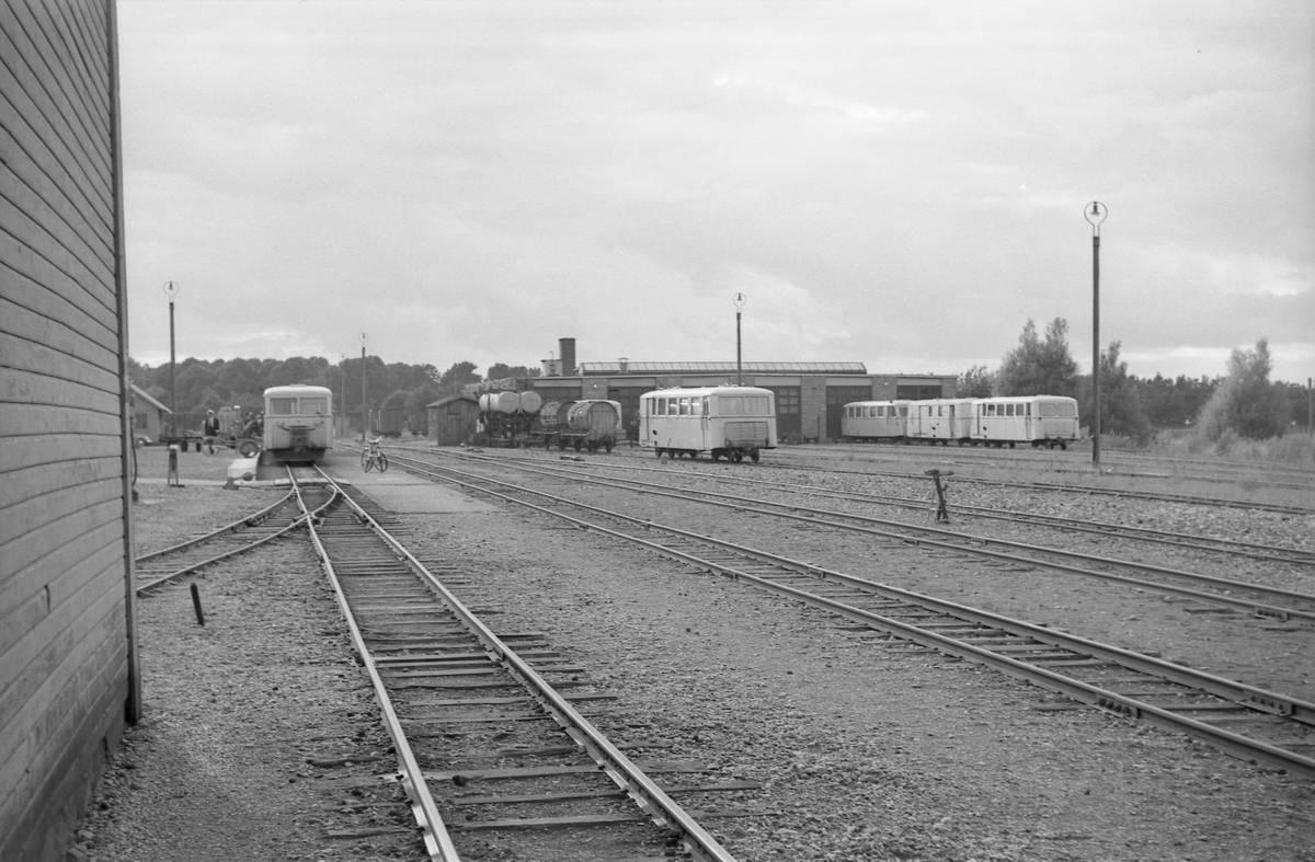 Motorvagnar och lokstall vid Borgholm järnvägsstation.