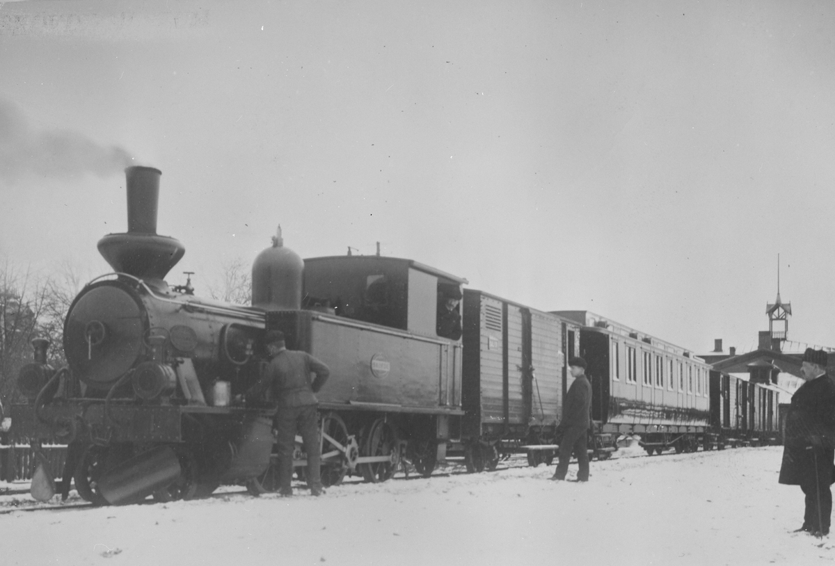 Skövde - Axvalls Järnväg, SAJ lok 1 "Sköfvde" med vagnar.