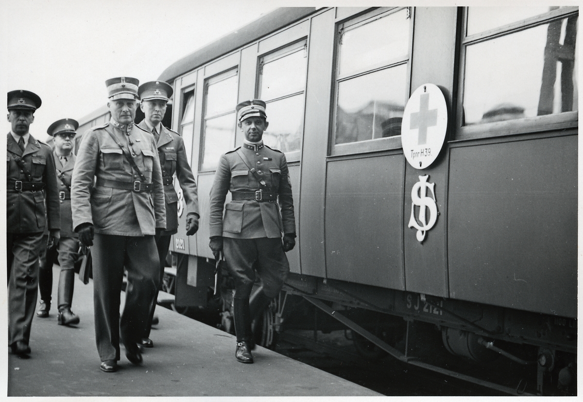 Sveriges Överbefälhavare, General Olof Thörnell och Byråchefen vid Kungliga Järnvägsstyrelsen, Överstelöjtnant Henrik Wrede står framför Statens Järnvägar, SJ Sjukhuståg Tpnr H39. Vagnen är Statens Järnvägar, SJ C3d 2121.