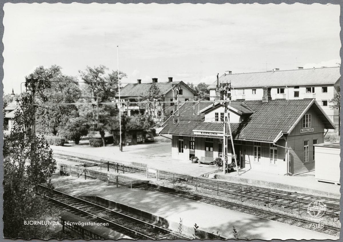 Stationsområdet i Björnlunda. Observera kontaktledningsstolpens nära placering till stationshuset.
